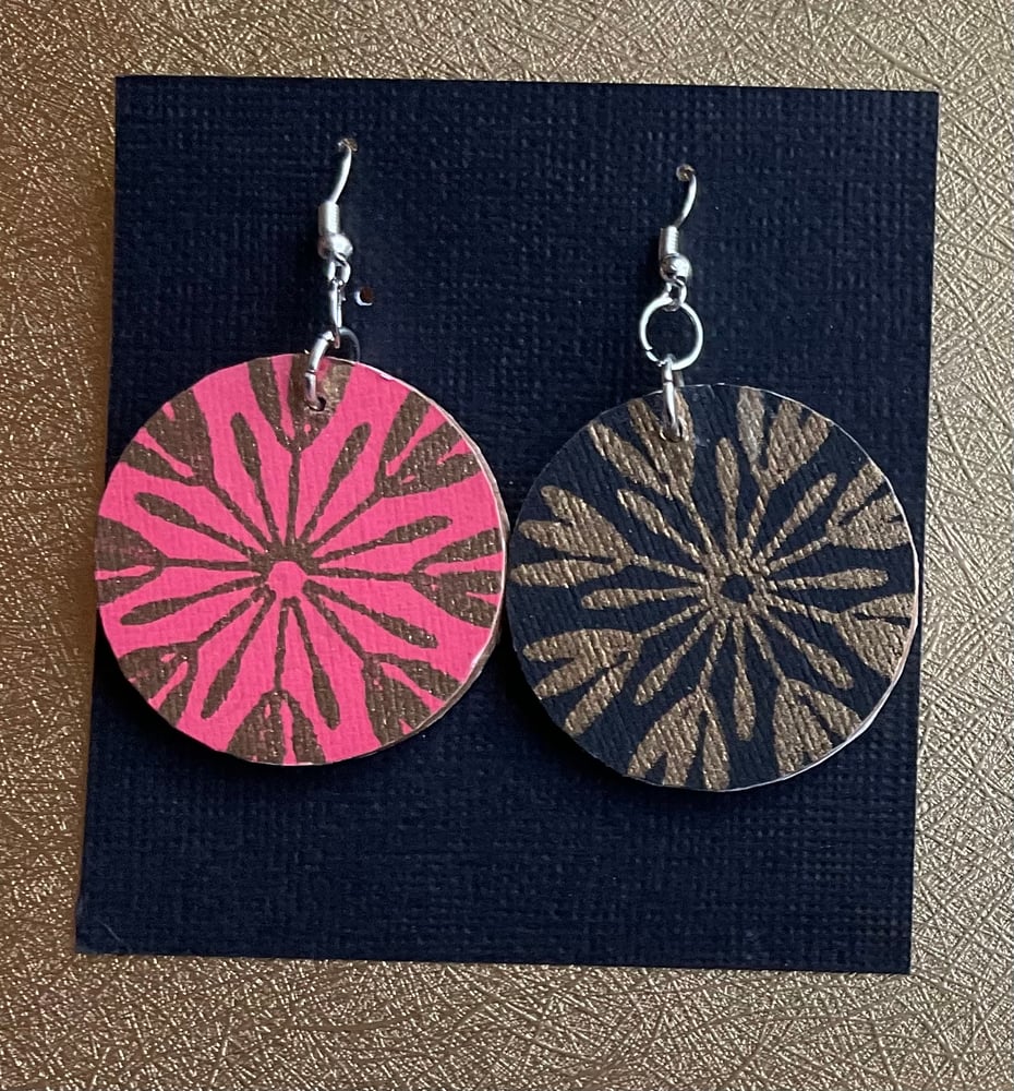 Paper collaged 1.5” round wooden earrings with a different and contrasting design on the backside. Very light in weight and sturdy to wear. FREE SHIPPING!