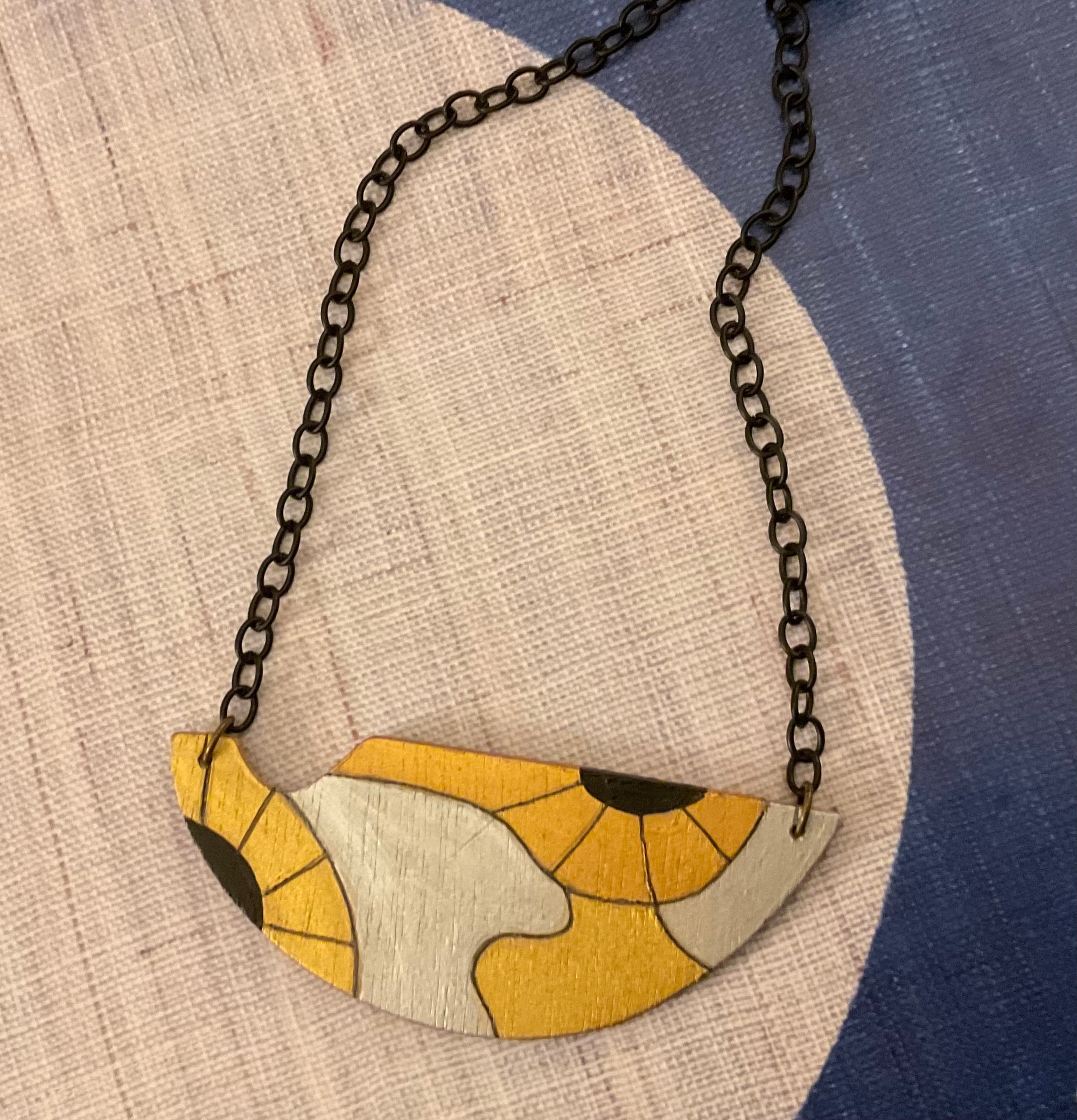 This one of a kind wooden piece necklace is designed and painted with metallic paints. It has a black chain and measures 8.5” long closed. FREE SHIPPING INCLUDED!