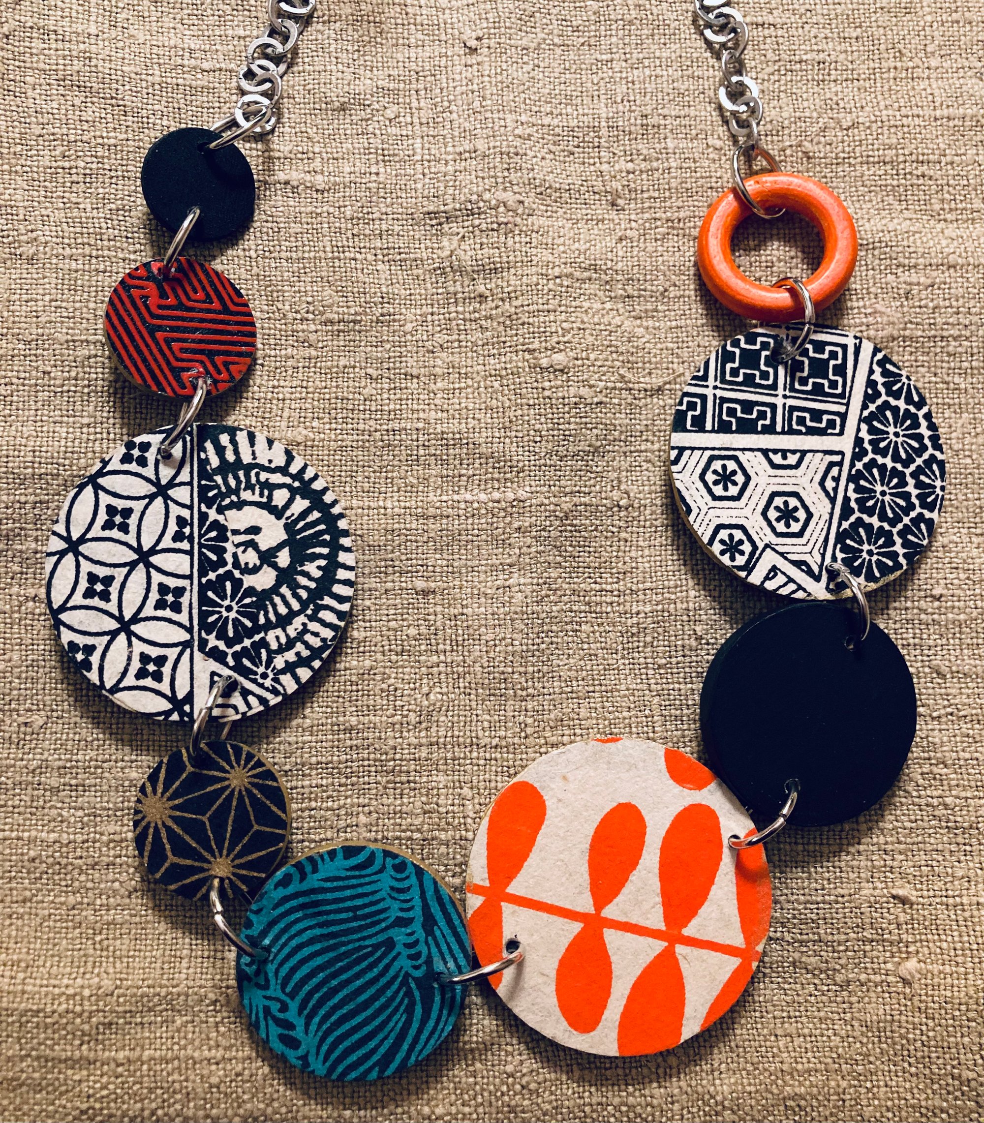 This fun one of a kind wooden pieced necklace is collaged with Japanese decorative papers and a silver colored chain and is reversible as well. It is very light in weight and measures 13’’ long closed. FREE SHIPPING INCLUDED!