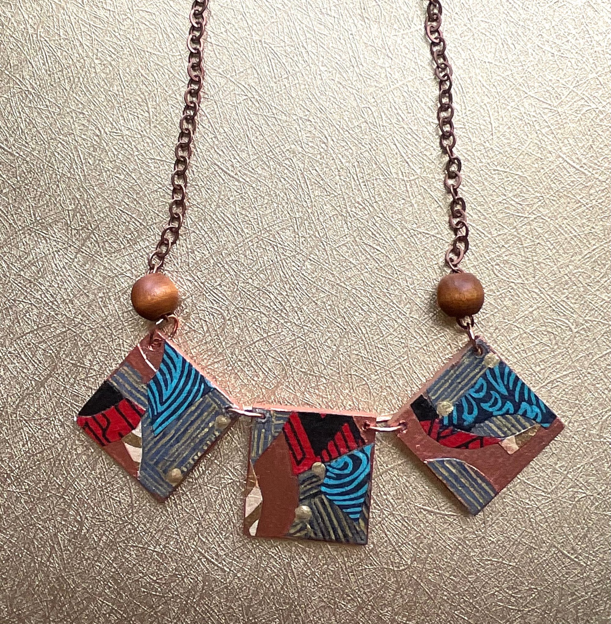 This one of a kind wooden pieced necklace is painted and collaged with paper designs. The 3 pieces are 1 1/4” square with wooden beads and a copper colored chain. It measures 10” long closed. FREE SHIPPING INCLUDED!