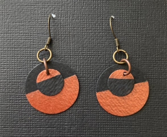Copper and black heavyweight paper earrings with 1” round and 1/2” round free flowing metallic painted pieces. Very light in weight and sturdy to wear. FREE SHIPPING!